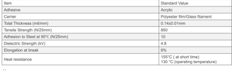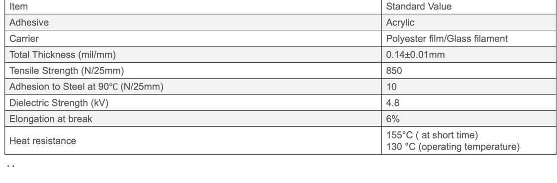 Cinta reforzada con película de poliéster / filamento de vidrio con cinta adhesiva acrílica termoendurecible sensible a la presión. Esta cinta es especialmente adecuada para aplicaciones de equipos de trabajo pesado en bandas de bobinas de inducido, anclajes, sujeción de cables de gran calibre en transformadores, bobinas y motores eléctricos.